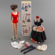 Barbie pop 'Bubble Cut Brunette' in rood badpak, op standaard in originele doos, uitvoering Mattel, Japan, 1960, daarbij: Volendammer barbiekostuum -doos iets beschadigd-, 30 x 7,5 x 4,5 cm