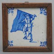 Delfts aardewerk tegel met blauw-wit decor in lijst: vaandeldrager, 17e/18e eeuw, 2 x14 x 14 cm