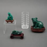 Drie malachiet beeldjes: hond, zwaan en aap, op houten basementjes, daarbij: glazen vaasje, 12,5 x 5,5 x 5,5 cm