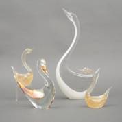 Vier glazen zwanenbeelden waarvan twee met poedergoud avventurina decor, waaronder uitvoering Les Arcades, Scheveningen, Holland, 44 x 22 x 6 cm