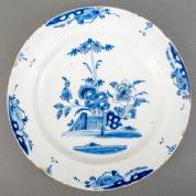 Delfts aardewerk schotel met blauw-wit tuindecor, 18e eeuw -randchips-, 5 Ø34 cm