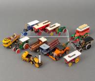 Verzameling miniatuurauto's, uitvoering Matchbox Yesteryear, waaronder: 1905 Fowler B6 Showmans Engine, Aveling & Porter Steam Road Roller, en Stephensons Rocket Train -één rupsband van 1922 Scania Vabis Bus ontbreekt-