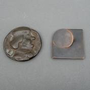 Twee penningen: Lijsbeth Teding van Berkhout (1946), 'Vierkant met cirkel in hoek', koperen jaarpenning, 1980, voor de Vereniging van Penningkunst, en Piet Esser (1914-2004), 'Oude Rembrandt', bronzen jaarpenning, 1988, beide voor de Vereniging van Penningkunst, Ø7 cm