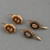 Twee paar oorhangers, één paar met onyx ingelegd met micromozaïek, de ander met goudsteen ingelegd met anker, 3 x 1,5 cm