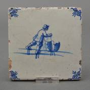 Aardewerk tegel met blauw-wit decor: schaatsende man, 19e eeuw -beetje glazuurverlies langs randen-, 1,5 x 13 13 cm