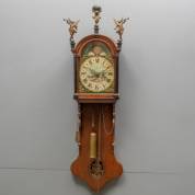Friese staartklok in eiken kast, de polychroom beschilderde wijzerplaat met latoenkoperen ornamenten van figuren en maanstandduiding, het geheel bekroond door Atlas en cherubijnen, Hollands, 19e/20e eeuw -gebruikssporen, defecten aan ornamenten-, 130 x 42 x 20 cm
