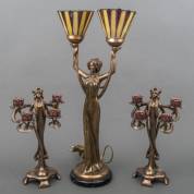Bronskleurige zamak tweelichts beeldlamp van een jonge vrouw met glas-in-loodkapjes, staand op gemarmerd houten basement, art nouveau-stijl, daarbij: paar bronskleurige kunststof vierlichts kandelaars, elk in de vorm van een jonge vrouw omgeven door florale motieven, art nouveau-stijl