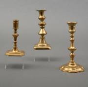 Drie diverse messing kandelaartjes, 18e en 19e eeuw -één gedeukt-, 20 x Ø 10 cm
