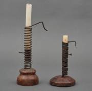Twee ijzeren spiraalvormige 'rat de cave' kandelaars op houten voet, West-Europa, 19e eeuw, 24 x Ø 9 cm