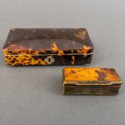 Rechthoekige schildpad lepeldoos -scheurtje in deksel-, en hoornen snuifdoosje met schildpad deksel, beide 19e eeuw, 15 x 5 x 8 cm