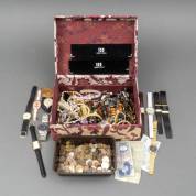 Diverse bijouterieën, waaronder: polshorloges, stalen armbanden en ringen -gebruikssporen- daarbij: muntgeld en biljetten, Nederland en wereld, 16 x 32,5 x 23,5 cm