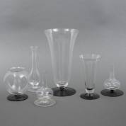 Zes diverse glazen bloemenvaasjes, waaronder orchideeënvaasje, alle ontwerp Andries Dirk Copier, uitvoering Glasfabriek Leerdam, de drie kleinste van etsmerk voorzien, 20e eeuw, 23,5 x Ø 13 cm