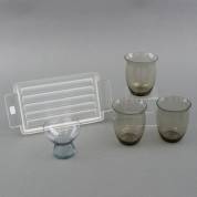 Drie rookglazen herdenkingsglazen 'Wilhelmina', ontwerp Andries Dirk Copier, uitvoering Glasfabriek Leerdam -één glas met randchips-, en drinkglas en dienblaadje, alle ontwerp Andries Dirk Copier, 9 x Ø 7,5 cm