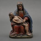 Gepolychromeerd lindenhouten beeldje: piëta, 19e eeuw -polychromie enigszins sleets, klein stukje wijsvinger afgebroken-, 21 x 13 x 7,5 cm