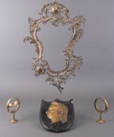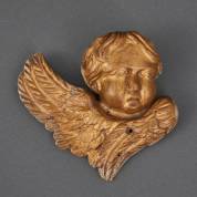 Gestoken en verguld houten cherubijnkopje, vermoedelijk meubelonderdeel, 18e eeuw -oude houtwormgaatjes-, 14 x 16 x 5 cm