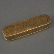 Gegraveerde messing tabaksdoos, het deksel en de onderzijde met Bijbelse voorstellingen, het front met de spreuk: 'O Werelds Mens 8 Ú Wens good en denckt Te Sterven', Hollands, 18e eeuw, 3,5 x 18 x 4 cm