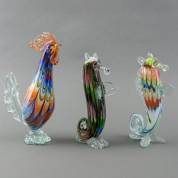 Drie gekleurde glazen beeldjes: twee zeepaardjes, en haan, Murano, 33 x 20 x 9 cm