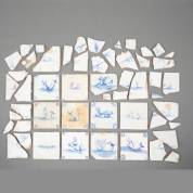 Tien diverse blauw-witte aardewerk tegels met decor van zeewezens, waaronder: vliegende vis, zeeduivel met hoorns, en waterdraak -restauraties en defecten-, daarbij: veel scherven van tegels met blauw-wit decor van zeewezens, 17e-19e eeuw, 13 x 13 cm