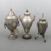 Drie tinnen kraantjeskannen -één schroefknop kraantje ontbreekt-, 44 Ø20 cm