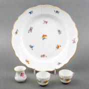 Duits porseleinen schotel met bloemdecor, uitvoering Meissen -barst-, daarbij: twee kopjes met goud drakendecor en een vaasje -2e keus-, alle Meissen, 5 x Ø35 cm