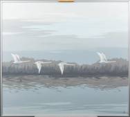 Pieter Jan in 't Veld (20e eeuw), opvliegende zwanen boven de waterkant, olieverf op board, r.o. gemonogrammeerd en gedateerd '84, 88 x 99 cm