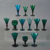 Elf diverse donkergroene rijnwijnglazen en één roemer, alle begin 19e eeuw, 14 x Ø 6,5 cm