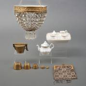 Divers kleingoed: pegellampje, poppenserviesje, kraaltjesbeurs, en setje sluitgewichten, 4 x 11 cm