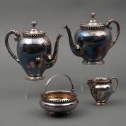Vierdelig verzilverd theeservies, bestaande uit: koffiepot, theepot, suikerschaal en melkkan, 21 x 23 x 12 cm