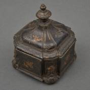 Zwartgelakte tinnen tabakspot met verguld bloemdecor, 18e eeuw -gebruikssporen/defecten-, 17 x 12,5 x 12,5 cm