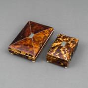 Twee schildpad doosjes met zilveren inleg, de een groter dan de ander, 19e eeuw -enkele defecten-, 11 x 7,5 x 3 cm