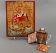 Oosters-orthodoxe icoon met dubbele afbeelding: Sint Nicolaas en Sint Nicolaas afgebeeld als beschermheilige van reizigers op een zeilschip, 20e eeuw -craquelé- daarbij: kleine moderne houten reisicoon -missend touwtje-, 29 x 23 x 2,5 cm