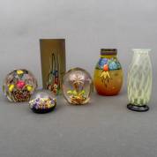 Twee bolvormige en één gefacetteerde presse-papiers, daarbij: drie kleurrijke glazen vaasjes