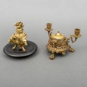Messing inktpotje geflankeerd door twee kaarsenhoudertjes, gedecoreerd met mascarons en voluten -barst in glazen inktpotje-, en messing inktpotje gedecoreerd met ramskoppen en gehoornde mascarons, staand op zwart houten schotel