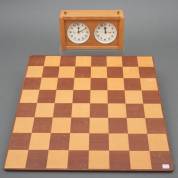 Houten schaak- en dambord, en schaakklok in houten kast, 46,5 x 46,5 cm