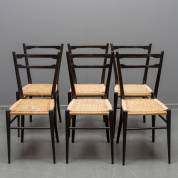 Zes gezwart houten eetkamerstoelen met rieten zitting, in de stijl van Gio Ponti's Superlegerra stoel, tweede helft 20e eeuw -gebruikssporen, enkele losse stukjes riet aan zittingen-, 89 x 43 x 45 cm
