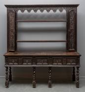 Gezwart eiken kabinet op getorste poten, in het rijk gestoken front drie lades, de opstand met bordenrek en twee deurtjes, Hollands, 18e/19e eeuw -gebruikssporen, restauraties, rechtsboven mist een stukje van de opstaande lijst-, 205 x 188 x 52 cm