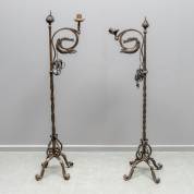 Paar smeedijzeren vloerlampen, uitlopend in een drakenfiguur -geen kappen-, 135 x 28 x 26 cm