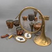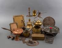 Divers messing en koperwerk, waaronder een blaasinstrument, puddingvormen en fotolijstjes, daarbij: paar tinnen kandelaars in de vorm van een vaas -gebruikssporen-