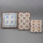Drie tegeltableaus: blauw-wit floraal decor -defecten-, geel-mangaanpaars lierdecor -oude schilderstape over tegels-, en bruin floraal decor, 19e eeuw, 2 x 42,5 x 42,5 cm