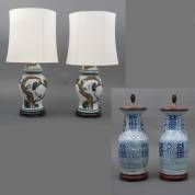 Een paar tot lampvoet vermaakte Chinees porseleinen vazen, daarbij: paar tafellampen in de vorm van bedekte vaas, 20e eeuw, 58 x Ø 20 cm