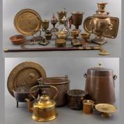 Grote verzameling koper en messing, waaronder: kannen, emmers, doofpot -gebruikssporen-, 45 x Ø 32 cm