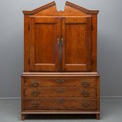 Eiken kabinet, de onderkast met drie lades, de bovenkast met twee deuren, en bronzen beslag, 18e eeuw, 202 x 130 x 56 cm