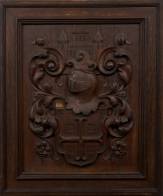 Eiken reliëf: ridderhelm boven wapenschild met kruis, 3,5 x 69 x 57,5 cm
