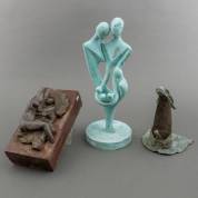 Drie metalen beelden: jong gezin, staand abstract figuur, en halfreliëf van naakte vrouw, op houten basement -basement aan vervanging toe-, 40 x Ø 18 cm