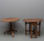 Eiken hangoortafeltje en rond eiken tafeltje staand op driespantpoot -beide gebruikssporen-, 70 x Ø 80 cm