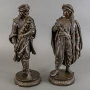 Paar gebronsd metalen beelden: Oosterse mannen, 20e eeuw -één beeld met gat in basement en defect geweer, één beeld met defect aan arm en zwaard-, 58 x 23 x 21 cm