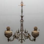 Rijk geornamenteerd hangend metalen frame voor twee petroleumlampen, 86 x 77 x 19 cm