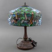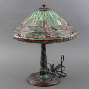 Tafellamp, de glas-in-loodkap met decor van libellen, de stam met gekruld decor in messing en glasmozaïek, Tiffany-stijl, eind 20e eeuw, 52 x Ø 42 cm