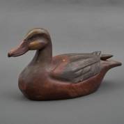 Grote polychroom beschilderde houten lokeend, 20e eeuw -gebruikssporen, krimpscheur over rug-, 34 x 60 x 23 cm