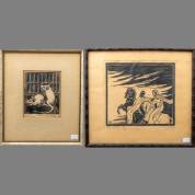 Twee houtsnedes: muisjes, gemonogrammeerd J.S., en ruiters in zandstorm, gemonogrammeerd E.N., beide onduidelijk gesigneerd, eerste helft 20e eeuw, 12 x 9 cm